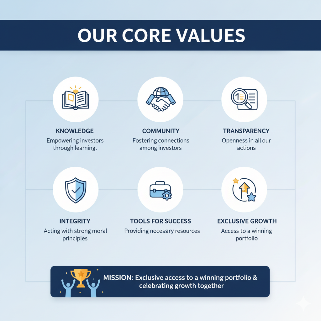 At our core, we believe in empowering investors through knowledge and community. We value transparency, integrity, ensuring our subscribers have the tools they need to succeed. Our mission is to provide exclusive access to a winning portfolio while fostering connections among investors who celebrate growth together.